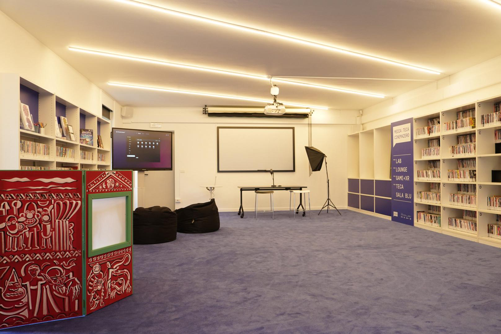 Infine, la SALA BLU sarà dedicata alla visione collettiva di film, documentari, materiali didattici e produzioni originali, trasformandosi all’occorrenza in una sala per cineforum, eventi speciali e approfondimenti tematici. Uno spazio pensato per vivere il cinema come momento di confronto e crescita, dove sarà possibile valorizzare anche quel cinema d’archivio e di ricerca, spaziando anche fra i generi meno battuti che gli utenti manifesteranno di voler vedere, che trova difficile collocazione in altri luoghi della cultura.