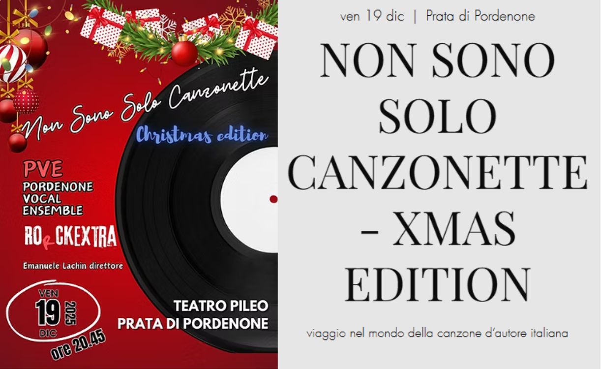 Venerdì 19 dicembre alle 21 al Teatro Pileo di Prata di Pordenone, il Comune e Ortoteatro propongono il concerto presentato dall’Associazione Musicale Gabriel Fauré Non Sono Solo Canzonette Xmas Edition, omaggio alla tradizione della musica leggera italiana. Con il PvE – Pordenone Vocal Ensemble Ro(r)ckExtra Emanuele Lachin, direttore.