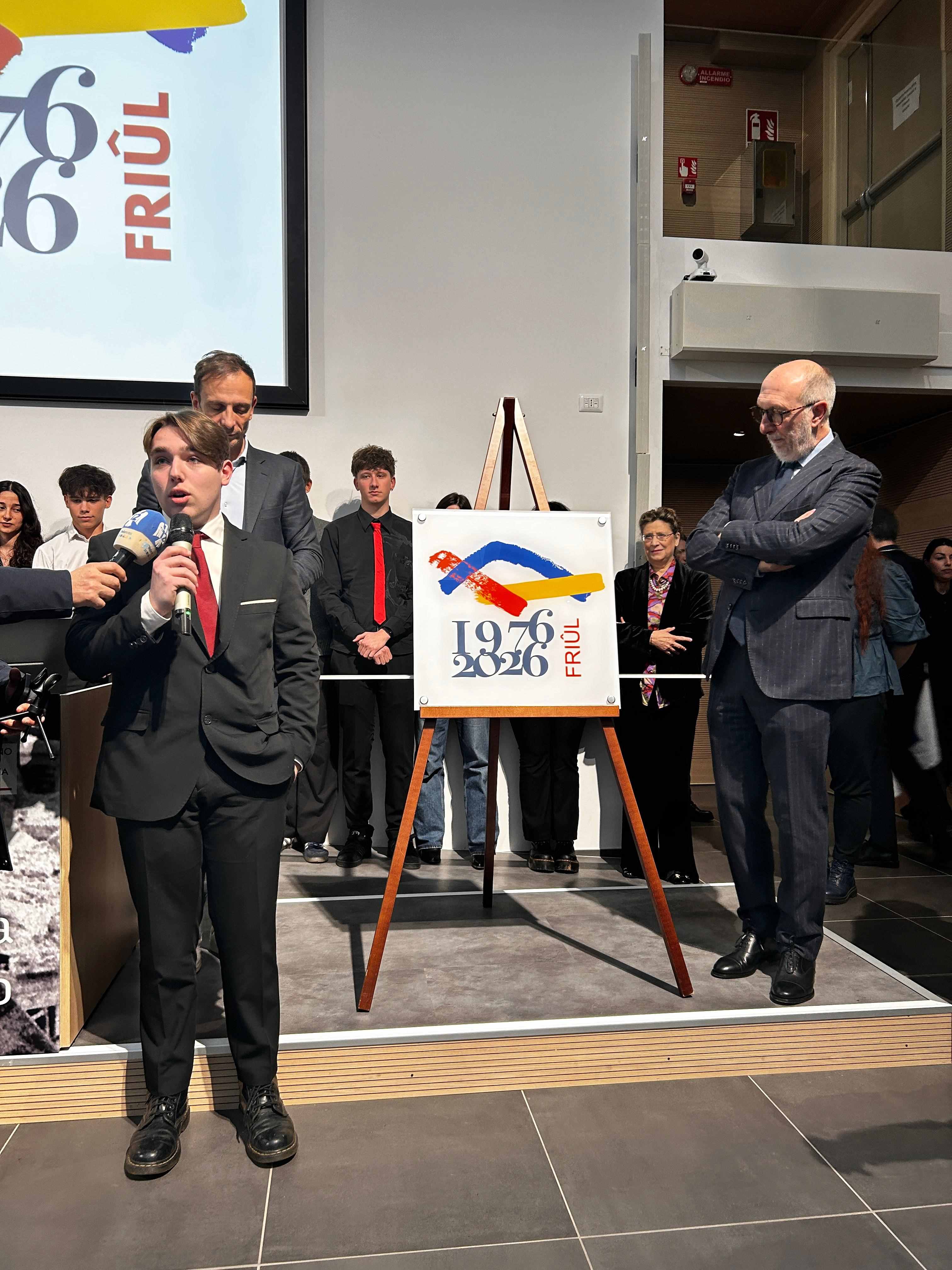 Davide Giroldo, 18 anni, di Portogruaro, è l’autore del logo scelto per rappresentare le iniziative legate al cinquantesimo dal terremoto del Friuli. Il giovane portogruarese è studente della classe 5^E (sezione grafica) del Liceo Artistico Enrico Galvani di Cordenons. Il suo progetto è stato il vincitore di un concorso per le scuole. La classe è stata premiata con un assegno di 5mila euro che la scuola utilizzerà per l’acquisto di materiale didattico. Nella sua opera Davide ha scelto tre segni grafici realizzati dapprima con pennello e tempera e poi rielaborati al computer: il segno azzurro rappresenta il territorio e delinea il profilo del Monte San Simone; il segno rosso, sgranato, rappresenta il terremoto che ha sconquassato questa terra; infine il segno giallo in risalita rappresenta la volontà della popolazione che si rialza dopo la tragedia. Inoltre alcune delle cifre (il 9, il 6 e lo 0) sono appositamente inclinate o rialzate, per rendere il movimento sussultorio e ondulatorio del terremoto.