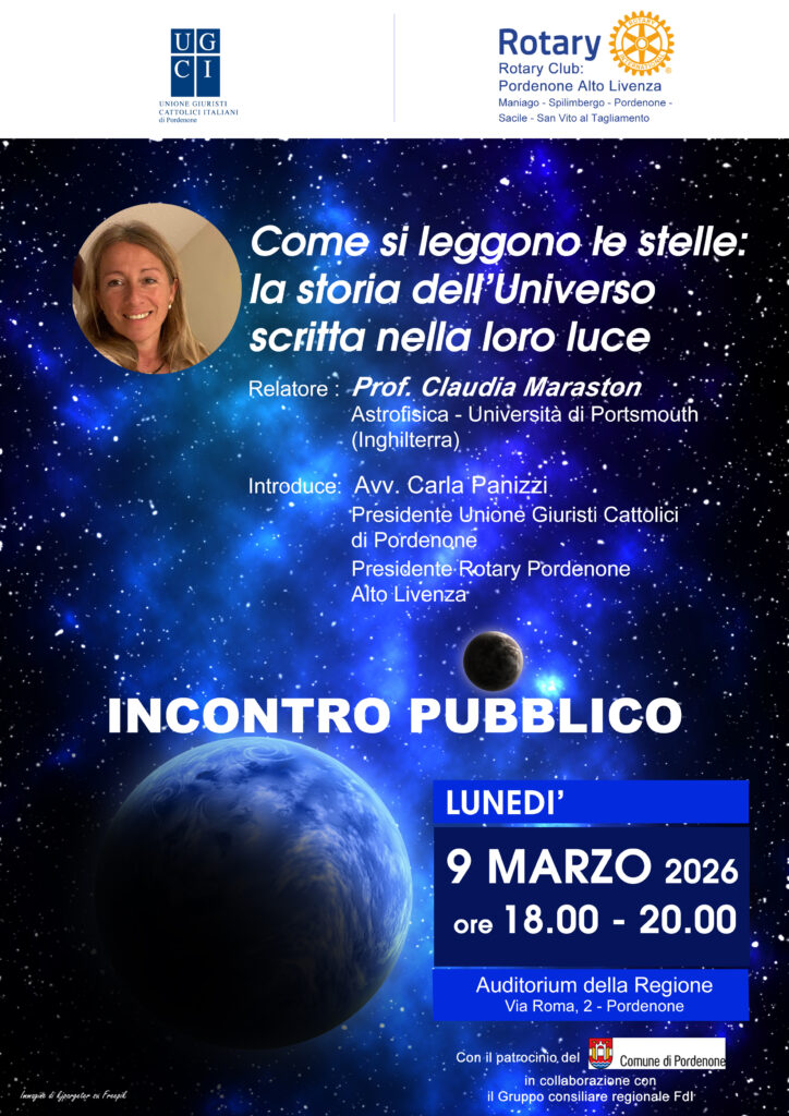 Maraston, astrofisica dell’Università di Portsmouth in Gran Bretagna e laureatasi all’Università di Bologna, terrà una lezione dal titolo “Come si leggono le stelle: la storia dell’Universo scritta nella loro luce”. Introduce Carla Panizzi, presidente dell’Ugci di Pordenone e presidente del Rotary Alto Livenza.