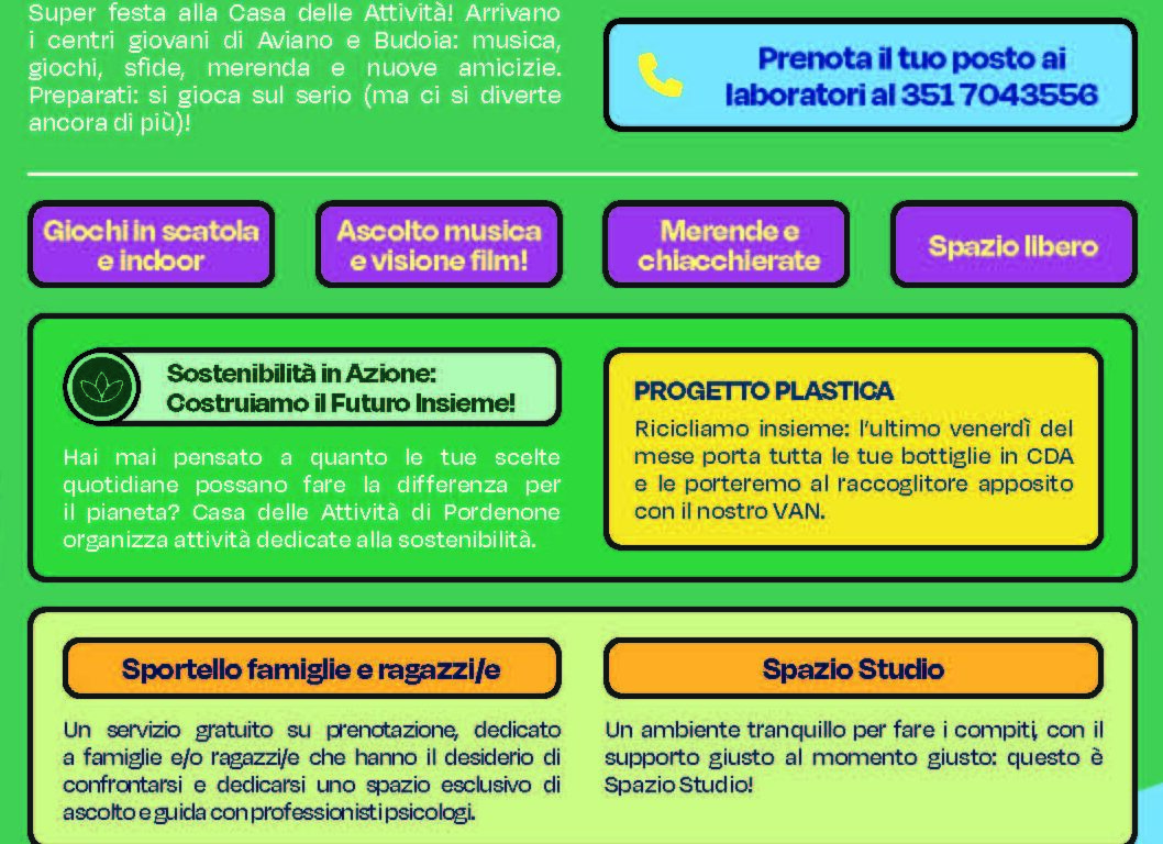 Grande festa per chiudere il mese in allegria e in compagnia: la Casa delle Attività ospita gli amici dei centri giovani di Aviano e di Budoia per un pomeriggio all’insegna di musica, giochi, sfide, merenda, tanto divertimento e nuove amicizie.