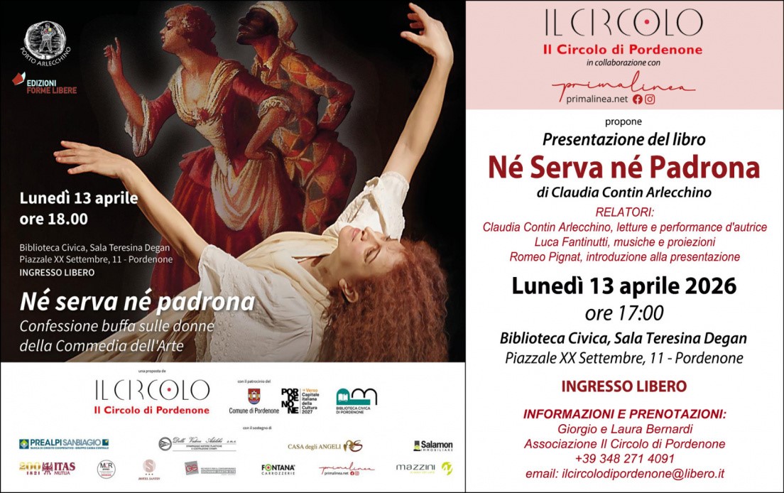 L’Associazione IL CIRCOLO di Pordenone, con il patrocinio di Comune di Pordenone, Pordenone Verso Capitale Italiana della Cultura 2027, Biblioteca Civica di Pordenone, In collaborazione con Primalinea – Pordenone, propongono lunedì 13 aprile alle 18 in Biblioteca Civica, Sala Teresina Degan lo spettacolo Né serva né padrona confessione buffa sulle donne della Commedia dell’Arte. Presentazione del libro con performance dell’autrice-attrice Claudia Contin Arlecchino, proiezioni e musica di Luca Fantinutti,