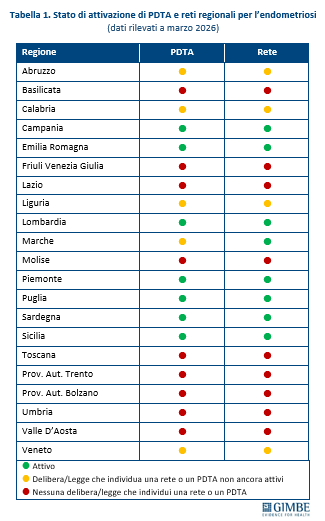 DISUGUAGLIANZE REGIONALI NELL’ASSISTENZA. Permangono marcate differenze tra le Regioni nell’organizzazione dell’assistenza: approvazione formale di Percorsi Diagnostico-Terapeutici Assistenziali (PDTA) e di reti cliniche regionali, distribuzione non omogenea di centri specialistici di riferimento e modalità di accesso alle prestazioni in esenzione. In particolare, la rilevazione aggiornata a marzo 2026 conferma un quadro frammentato: solo alcune Regioni – tra cui Campania, Emilia-Romagna, Lombardia, Piemonte, Puglia, Sardegna e Sicilia – dispongono sia di PDTA sia di reti cliniche attive, mentre in molte altre risultano parziali o assenti (tabella 1). Negli ultimi anni diverse Regioni hanno approvato leggi o provvedimenti specifici sull’endometriosi, tra cui Sicilia, Lombardia, Piemonte, Emilia-Romagna, Puglia, Sardegna, Veneto e Valle d’Aosta. Tuttavia, tali iniziative non sempre si traducono in un miglioramento concreto dell’accesso alle cure. «Il quadro resta molto eterogeneo – spiega Cartabellotta – con Regioni che hanno sviluppato reti cliniche e percorsi strutturati e altre dove l’organizzazione dell’assistenza è ancora frammentaria».