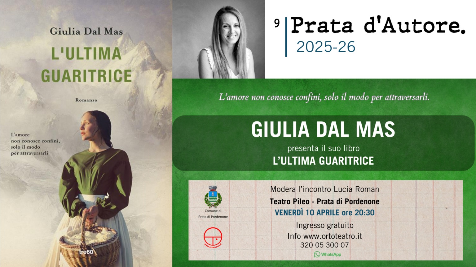 Venerdì 10 aprile alle 20.30 al Teatro Pileo di Prata di Pordenone, Comune e Biblioteca Civica in collaborazione con Ortoteatro nell’ambito di Prata d’Autore, propongono l’incontro con la scrittrice Giulia Dal Mas che presenta il suo ultimo libro L’ultima guaritrice TRE60. Modera la serata Lucia Roman