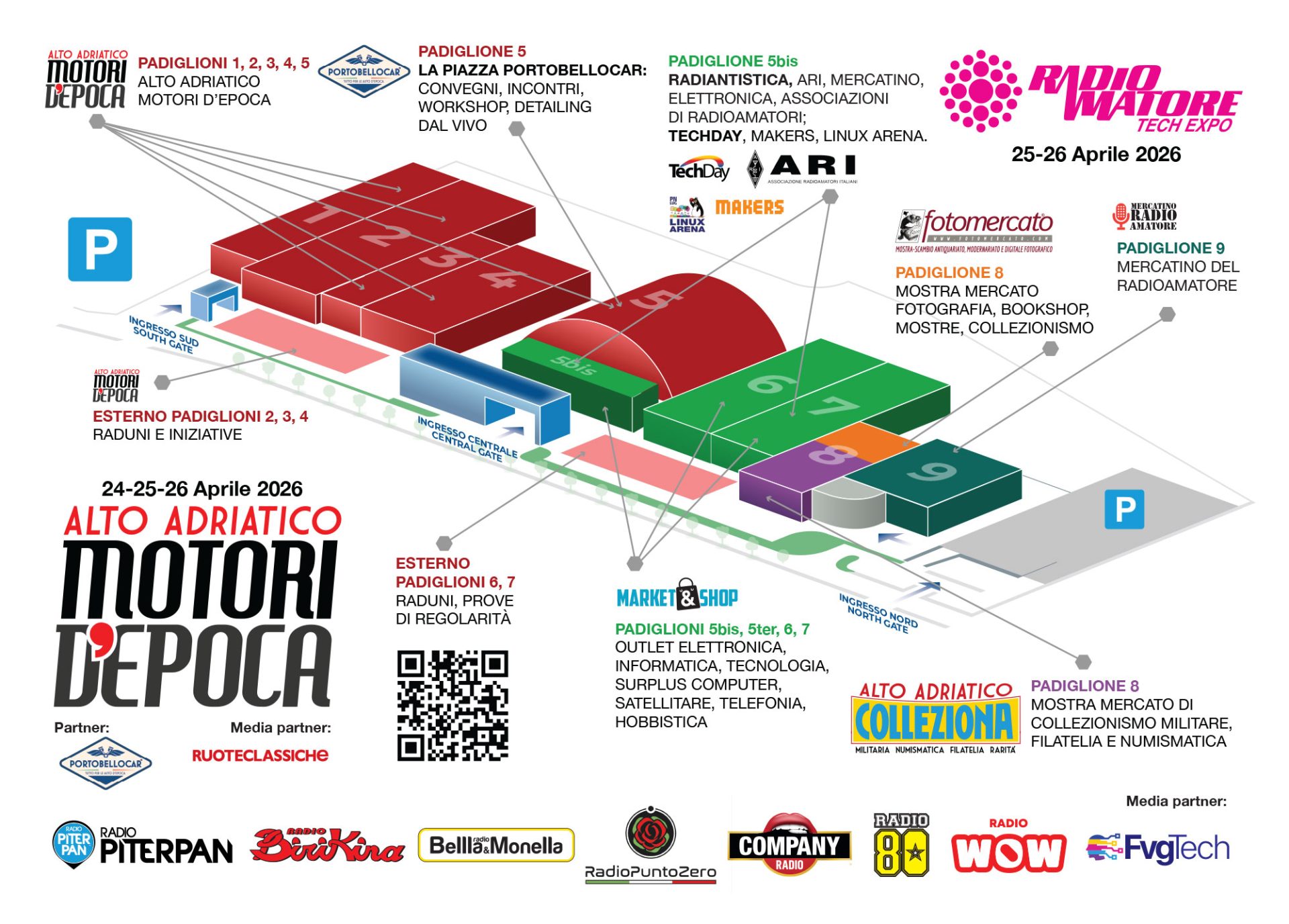 Con 5 padiglioni (dal n. 1 al n. 5), oltre 15.000 metri quadrati coperti e ampie aree esterne dedicate ai raduni, Alto Adriatico Motori d’Epoca si conferma, alla sua quarta edizione, uno degli appuntamenti più attesi del settore. Sono 150 espositori, tra concessionari, commercianti, privati e club a offrire una panoramica completa su auto, moto e mezzi storici, militari e vintage, ricambi, accessori e servizi di restauro. Oltre 12.000 mq sono dedicati a saloni e concessionari di auto e moto d’epoca, vintage e youngtimer, con aree per la vendita tra privati. In 3.000 mq trova spazio il mercatino di ricambi, accessori e gadget.